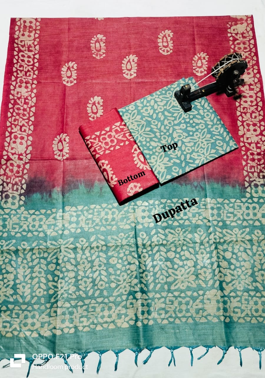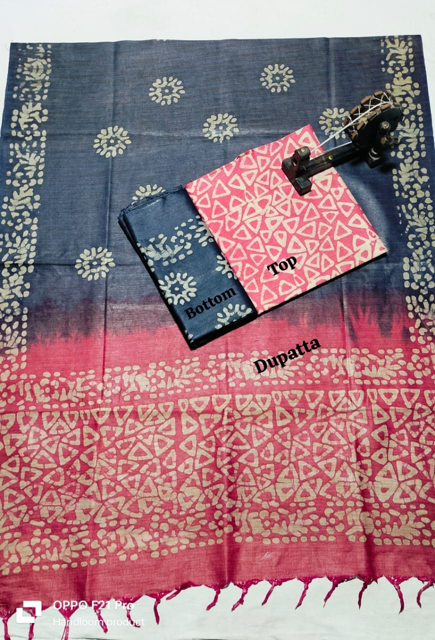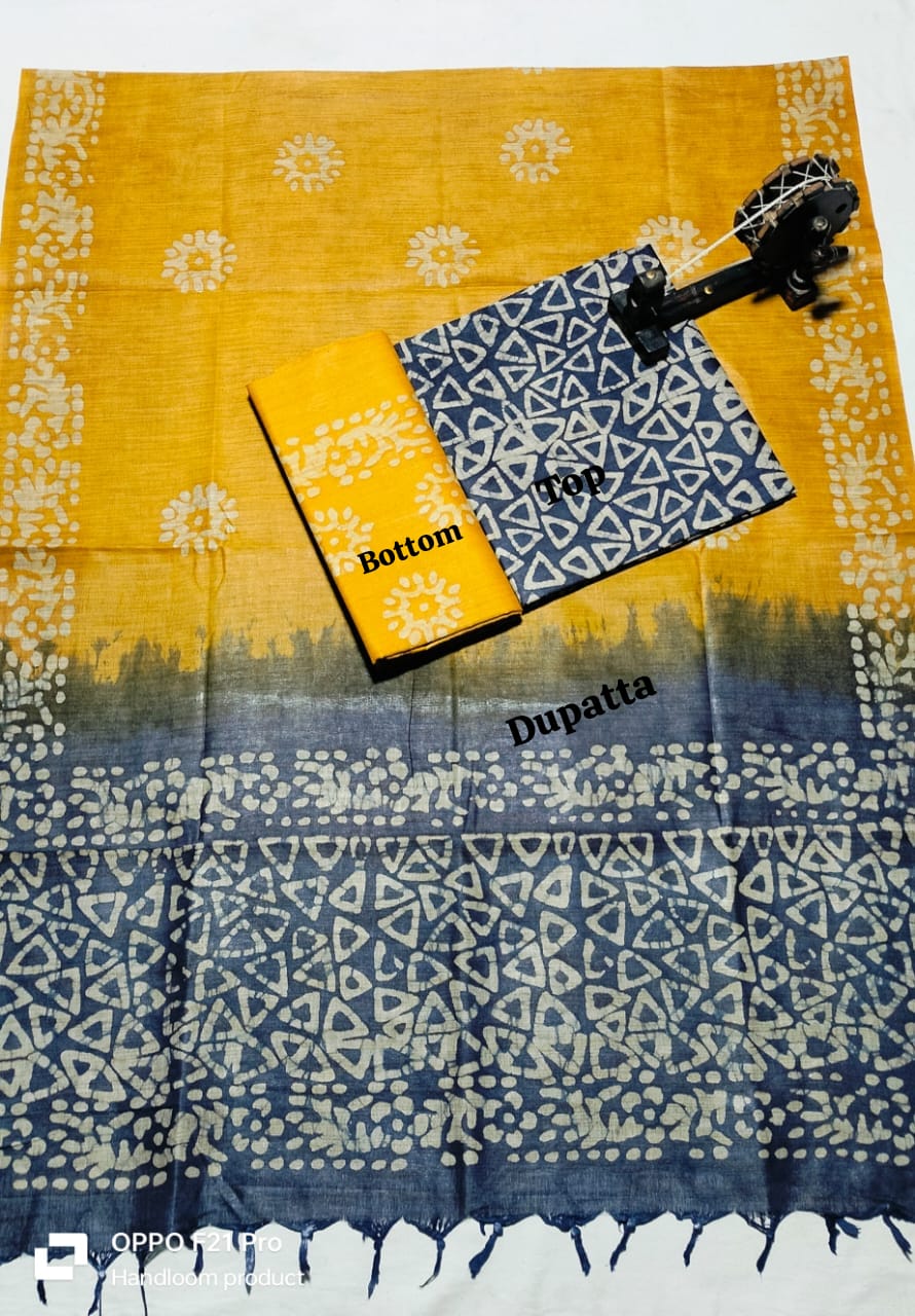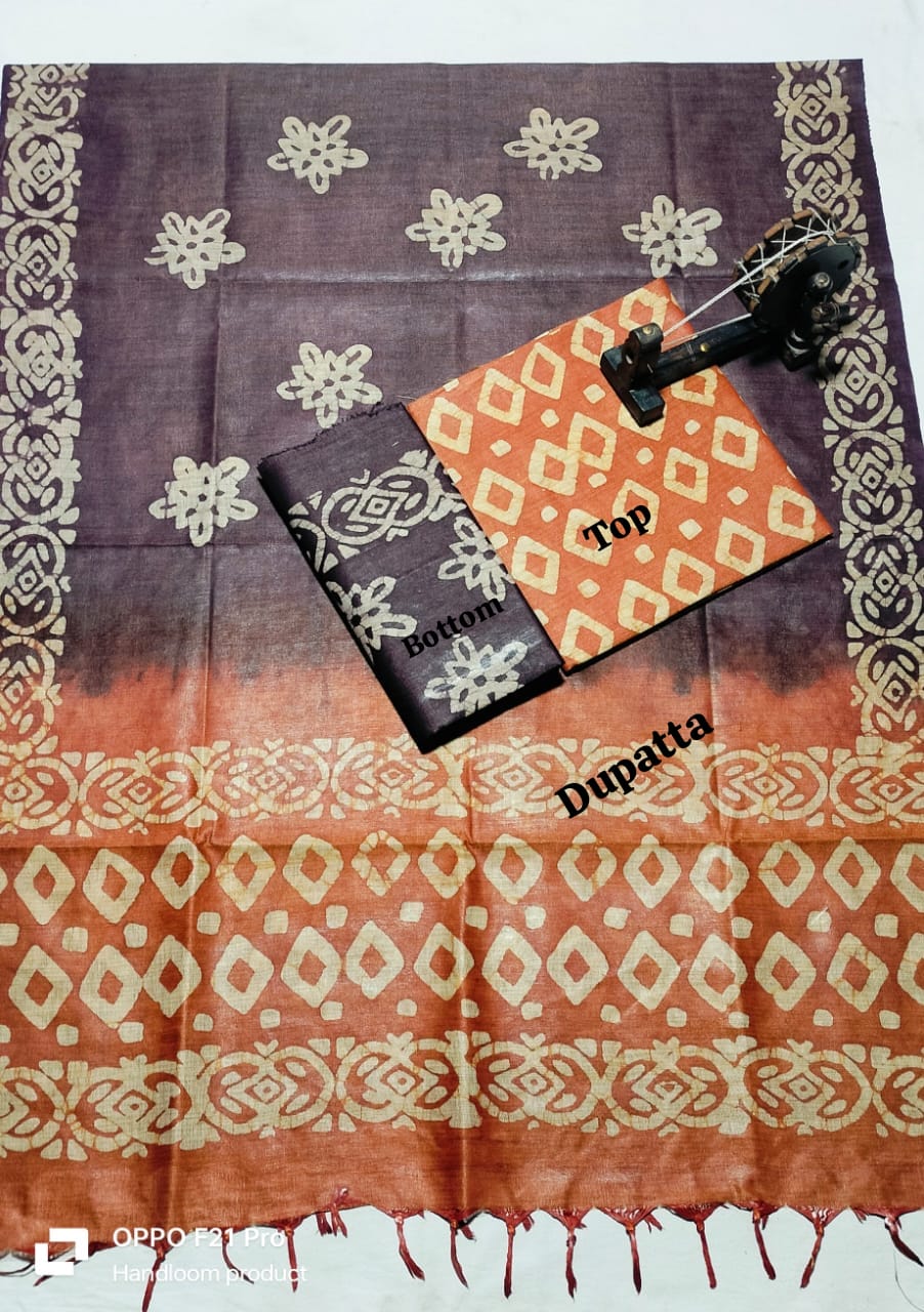 . Crafted from authentic khadi fabric, known for its breathability and durability, this collection includes coordinated pieces for top, bottom, and dupatta. The intricate batik patterns add artistic flair while maintaining the natural texture khadi enthusiasts appreciate. Perfect for creating traditional or contemporary ensembles, this material drapes beautifully and becomes softer with every wash. Ideal for the discerning weaver seeking quality, sustainability, and timeless style in one complete package.