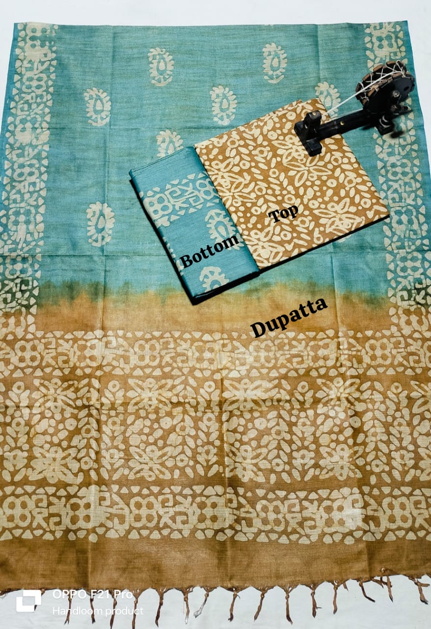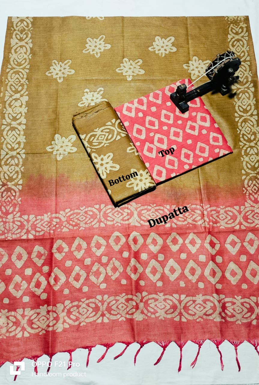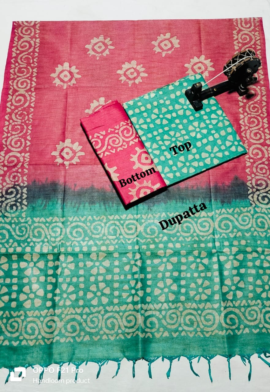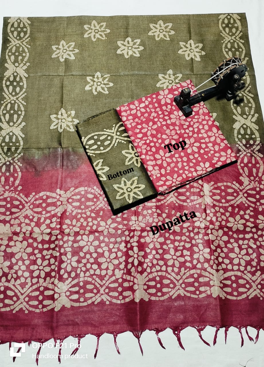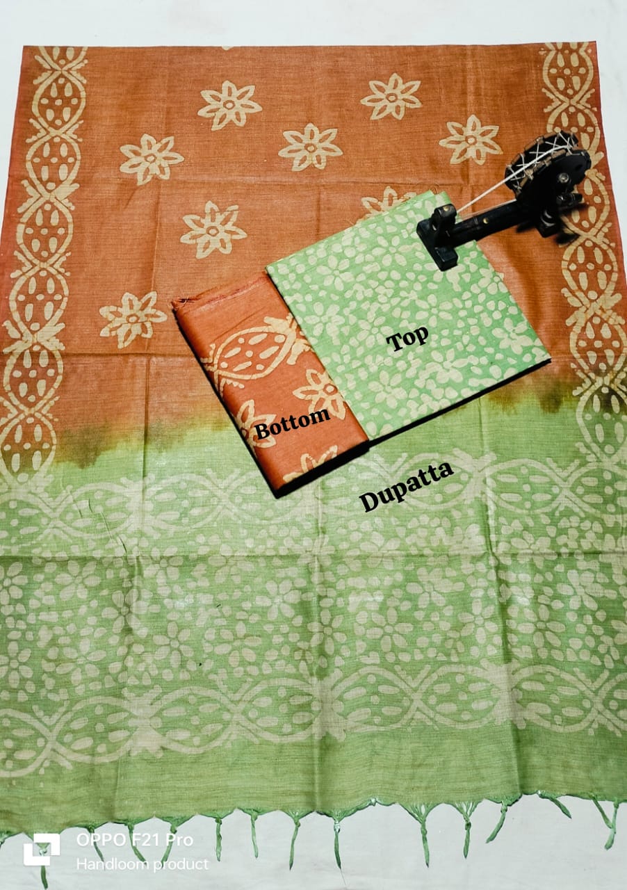 . Crafted from authentic khadi fabric, known for its breathability and durability, this collection includes coordinated pieces for top, bottom, and dupatta. The intricate batik patterns add artistic flair while maintaining the natural texture khadi enthusiasts appreciate. Perfect for creating traditional or contemporary ensembles, this material drapes beautifully and becomes softer with every wash. Ideal for the discerning weaver seeking quality, sustainability, and timeless style in one complete package.