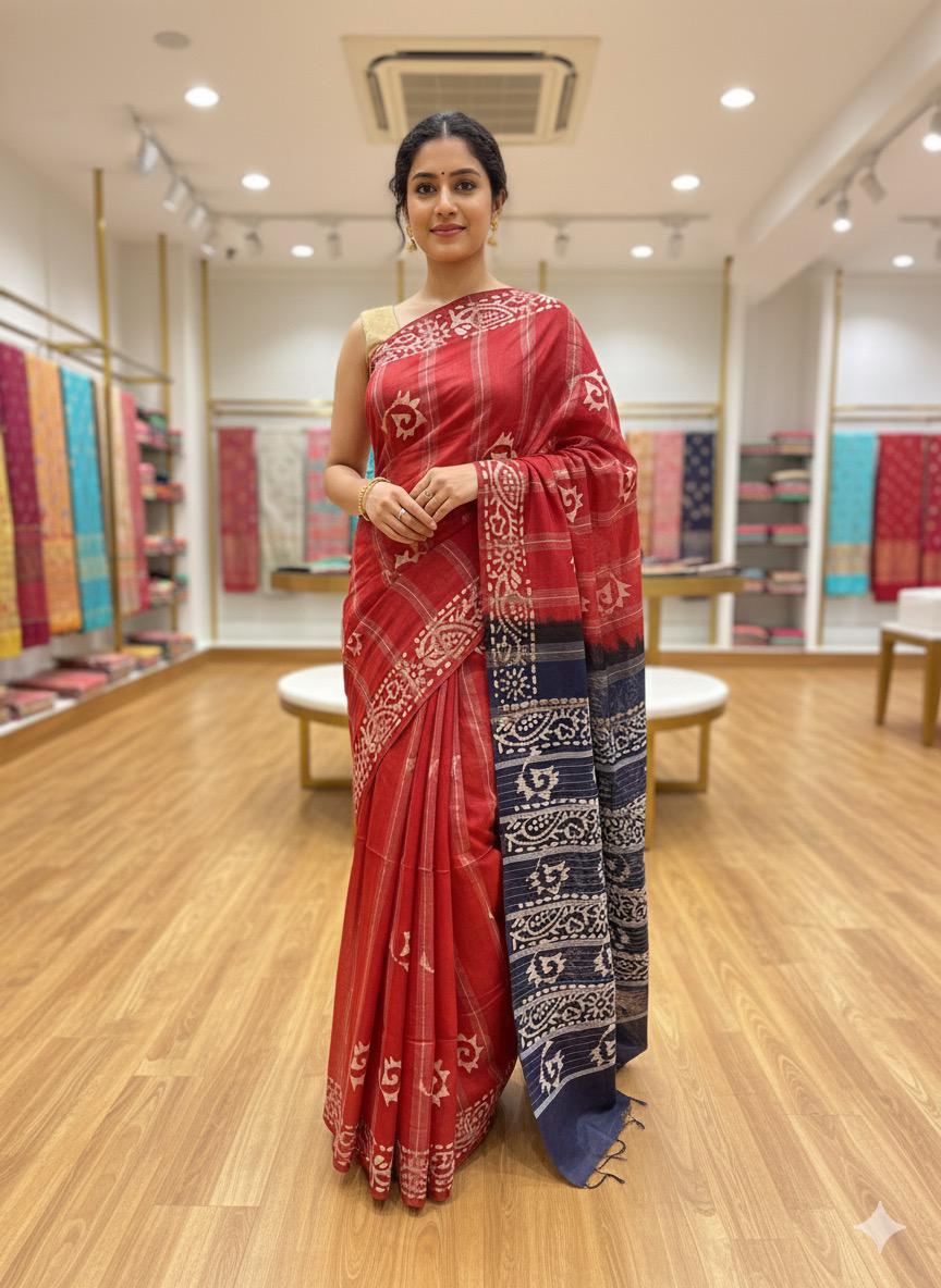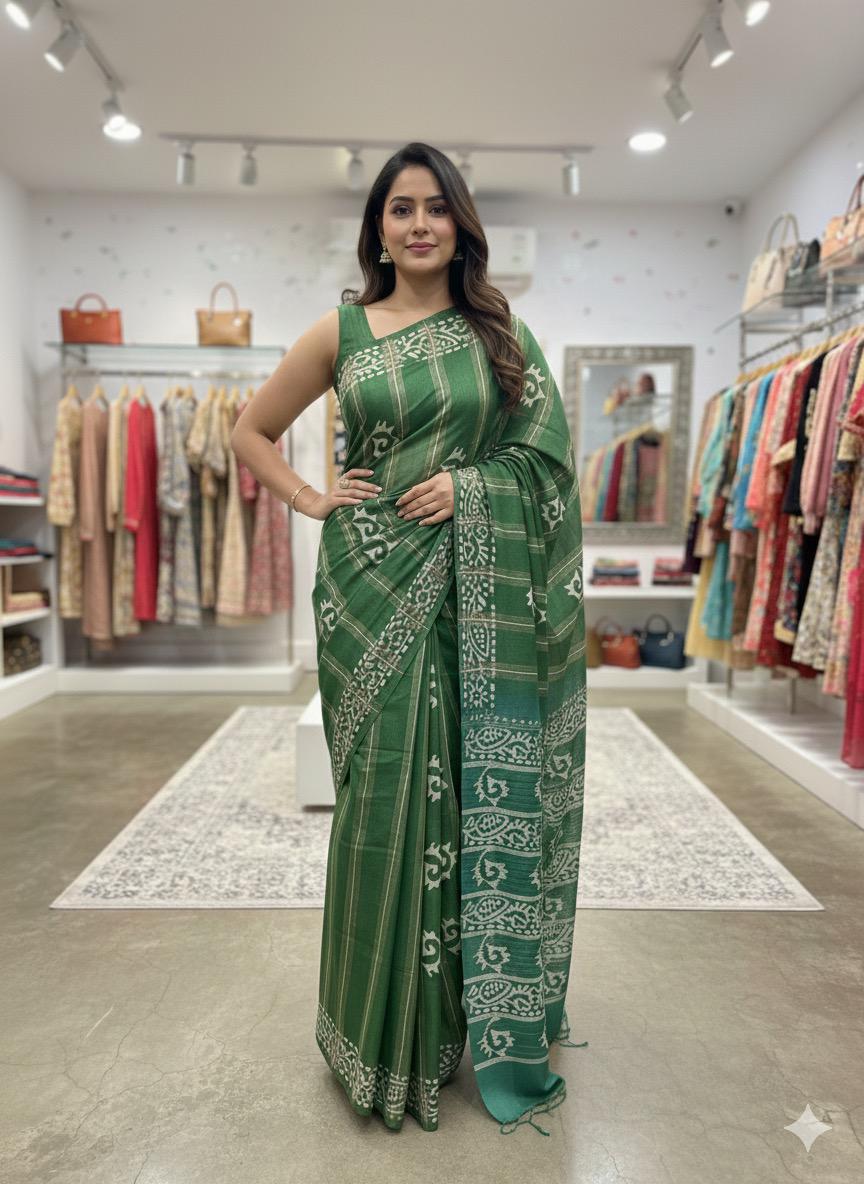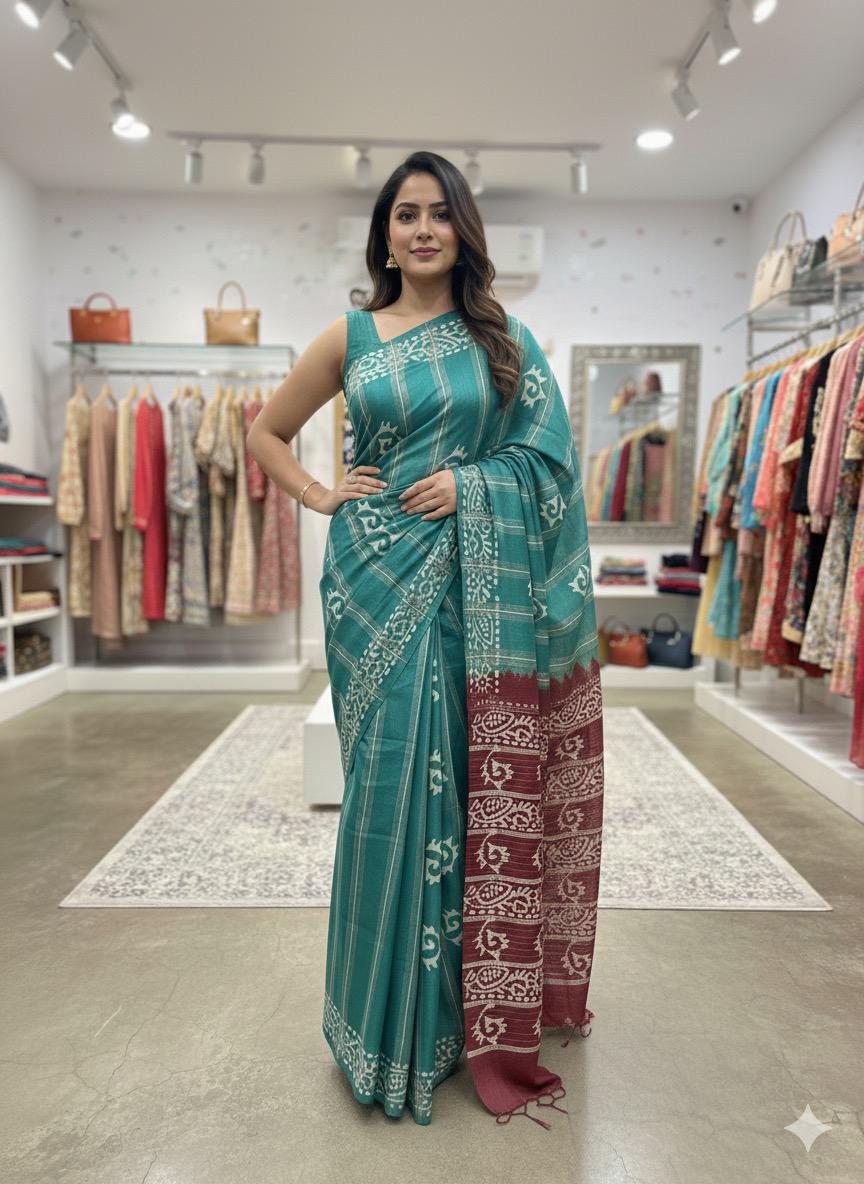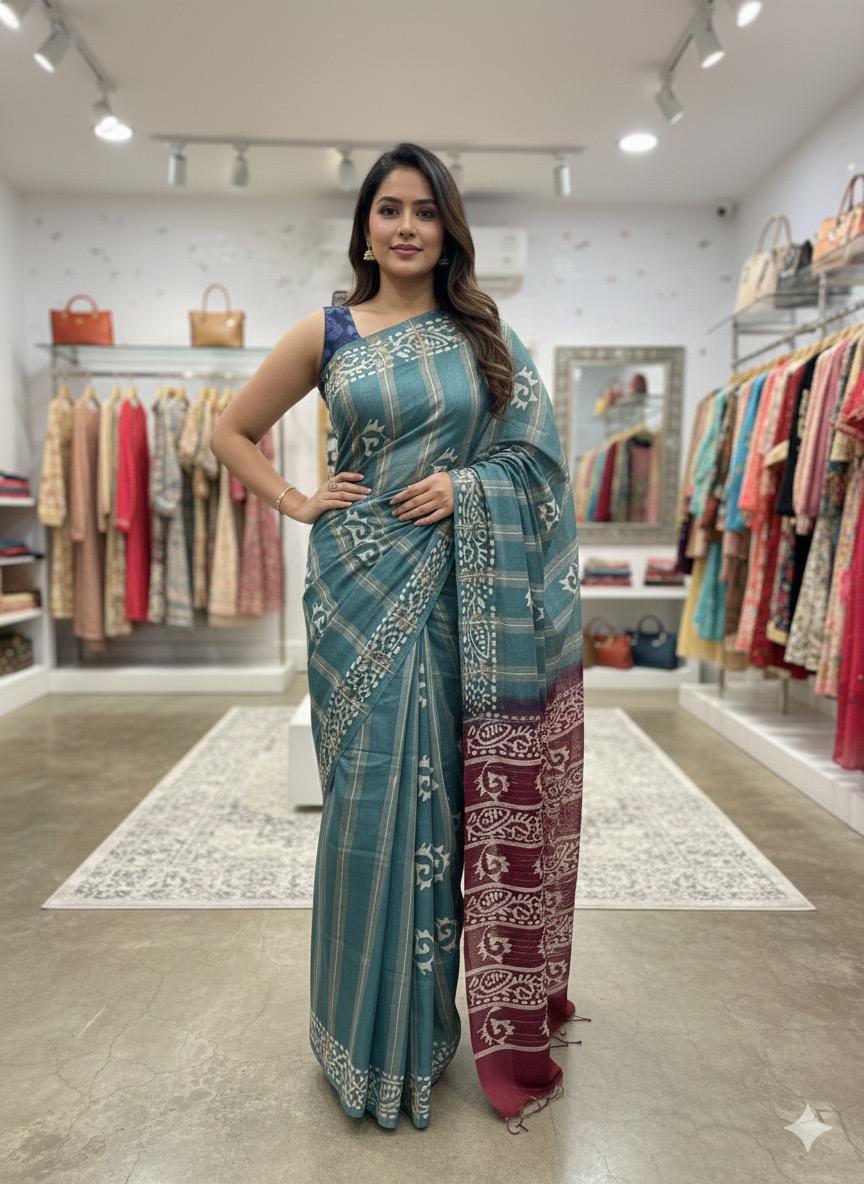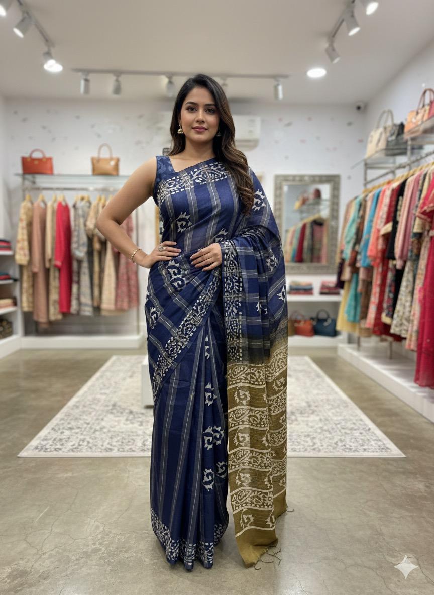 This elegant Bamboo Silk Batik Saree features a modern strip pattern created using the traditional batik wax-resist technique. The bamboo silk fabric gives a natural shine, lightweight feel, and smooth drape, making it comfortable to wear for long hours. The handcrafted batik lines and crackle textures offer a unique artistic appeal β each saree different from the other.