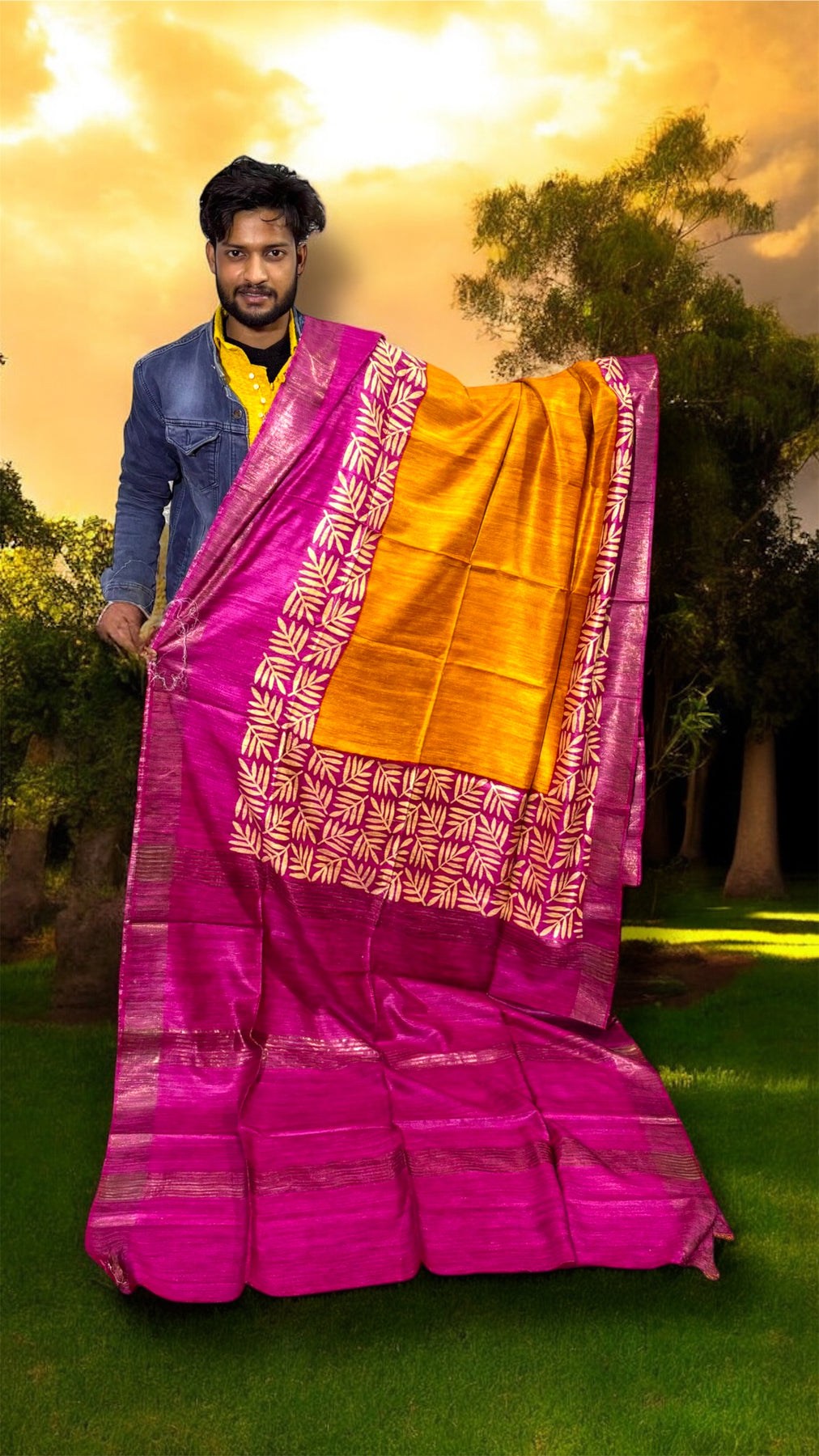 Perfect for festive occasions, weddings, and traditional gatherings. The contrast pink blouse beautifully enhances the earthy tones of Tusser silk, giving a graceful and sophisticated look.