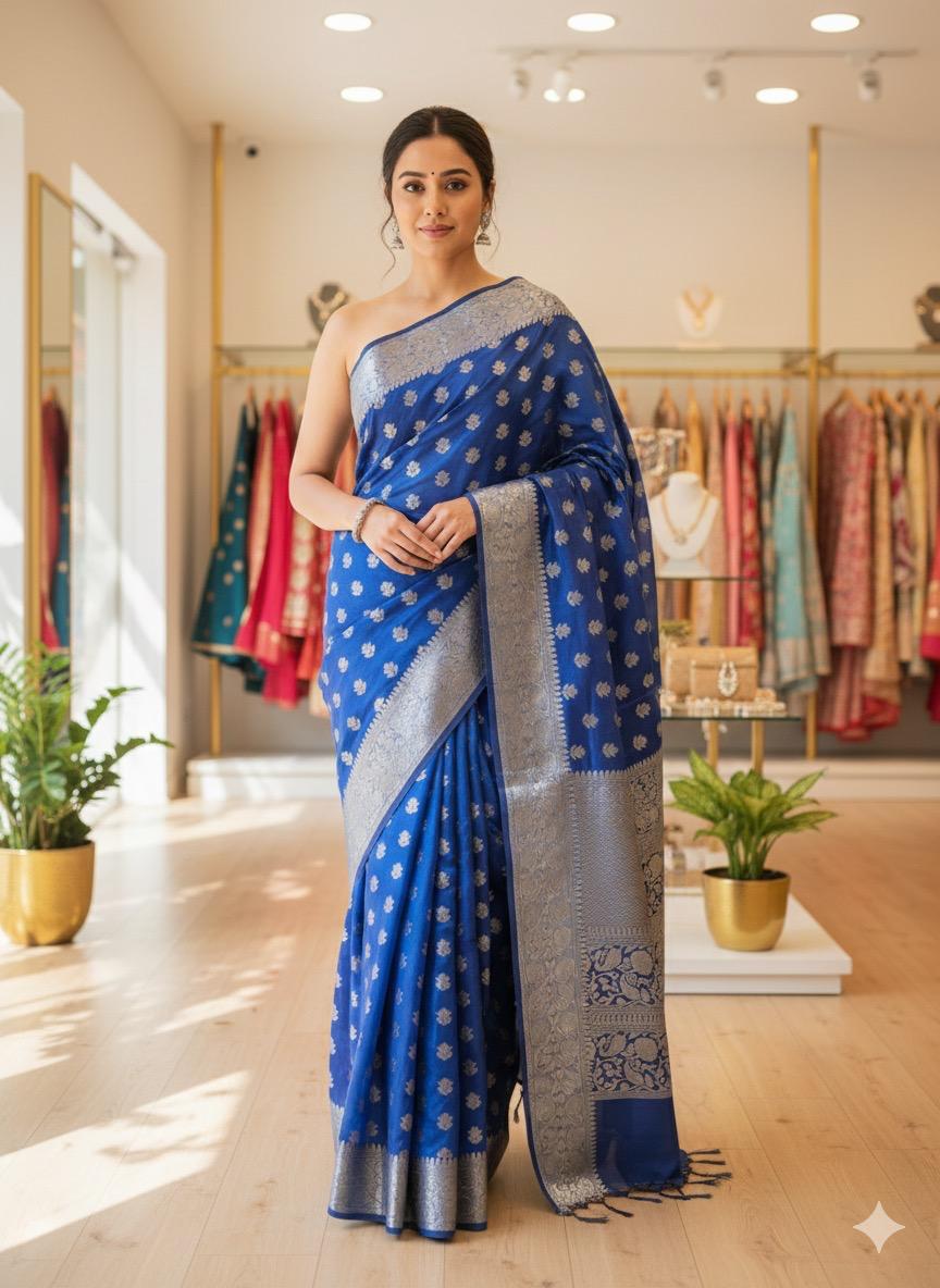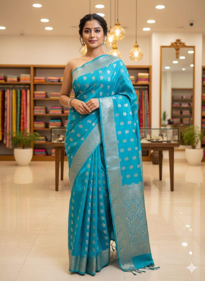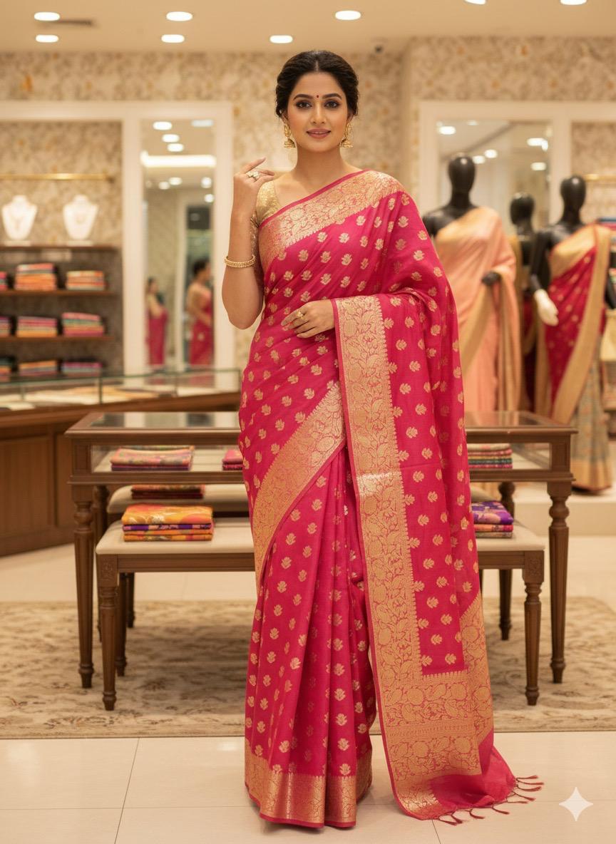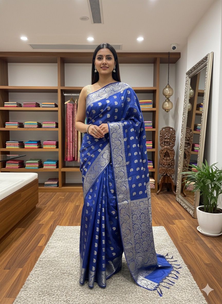 Banarasi Weaving Silk saree apni royal shine, traditional zari detailing aur elegant drape ke liye mashhoor hai. Iski weaving pattern Banaras ki heritage craftsmanship ko reflect karti hai, jisse yeh saree festive, wedding, aur special occasions ke liye perfect banat,i hai.