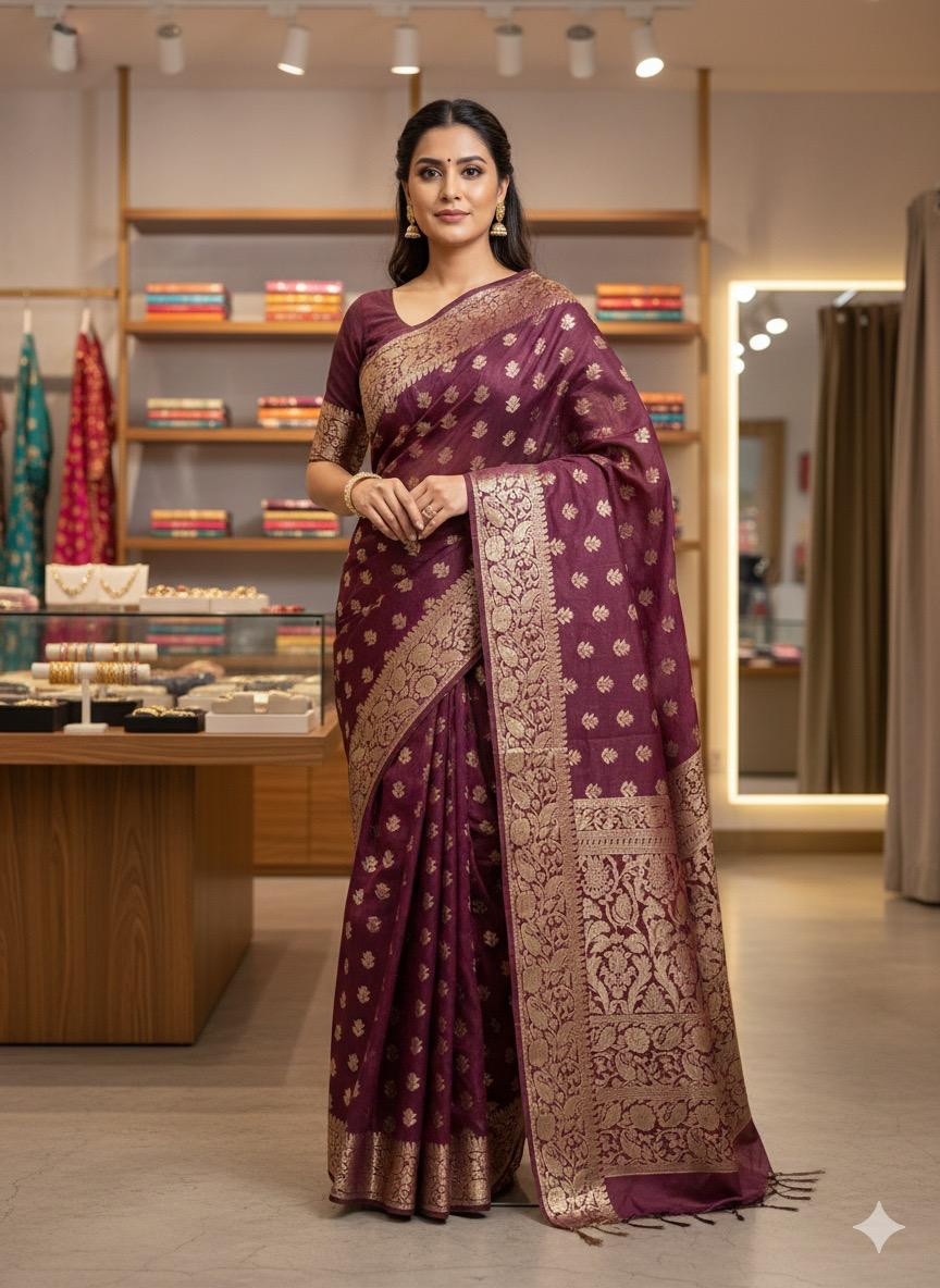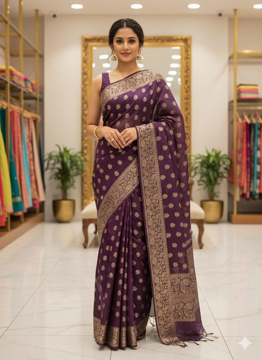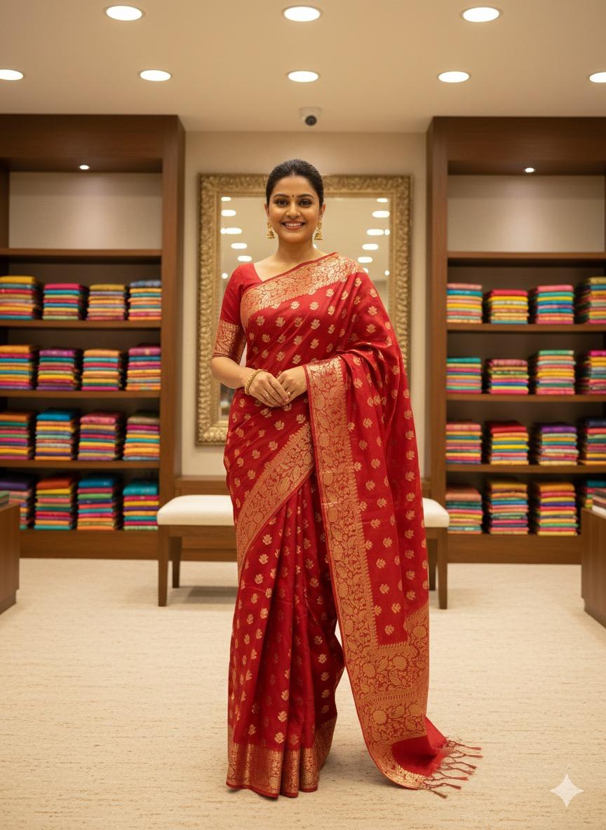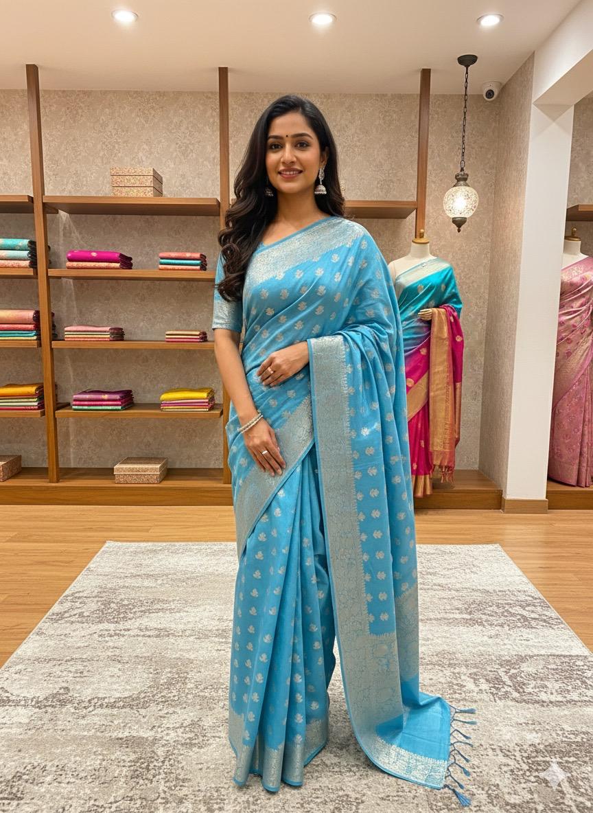 Banarasi Weaving Silk saree apni royal shine, traditional zari detailing aur elegant drape ke liye mashhoor hai. Iski weaving pattern Banaras ki heritage craftsmanship ko reflect karti hai, jisse yeh saree festive, wedding, aur special occasions ke liye perfect banat,i hai.